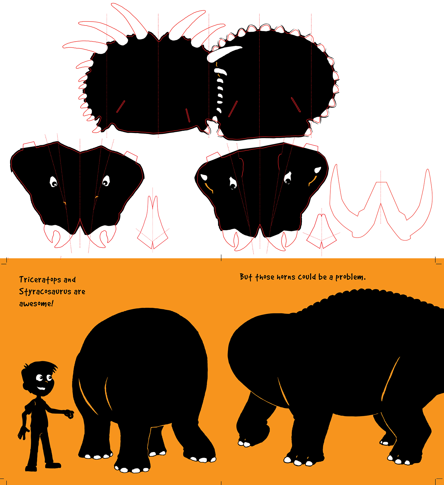 I wanted to do a combination of new mechanisms along with ones that were similar to the ones in Monster. The folks at Random House were especially fond of the wheel I had done in the first book, especially how it worked on two pages. I figured out a way to make the wheel turn and open and close the jaws of a T-Rex. It was a small element being turned by a large wheel but it was very effective. The other side changed three dinosaur heads on similar bodies.