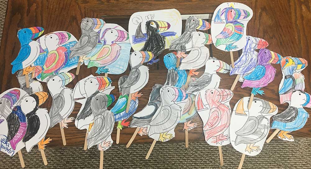 One last picture. The 1st grade students at Bells came in carrying puffins on sticks. At the end of the assembly one of them came up and said he wanted to give me his puffin. I thanked him and tucked it into my shirt pocket. Suddenly every student near us wanted to give me their puffins. I now have quite a large flock of puffins.