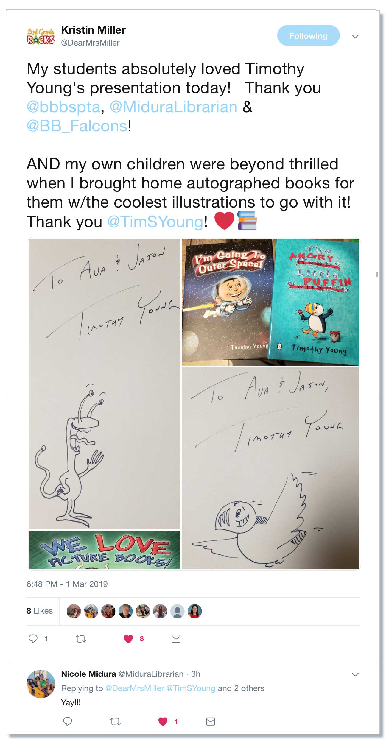 Happily, two of the school librarians (and one of the principals) posted on twitter. Not every school does, and it’s fine if they don’t. It’s hard for me to decide what to post after a visit. Some schools do not allow photos of students. Some are ok if you can’t see faces. It’s easier for me if the school has posted photos themselves, then I know I can share them.
