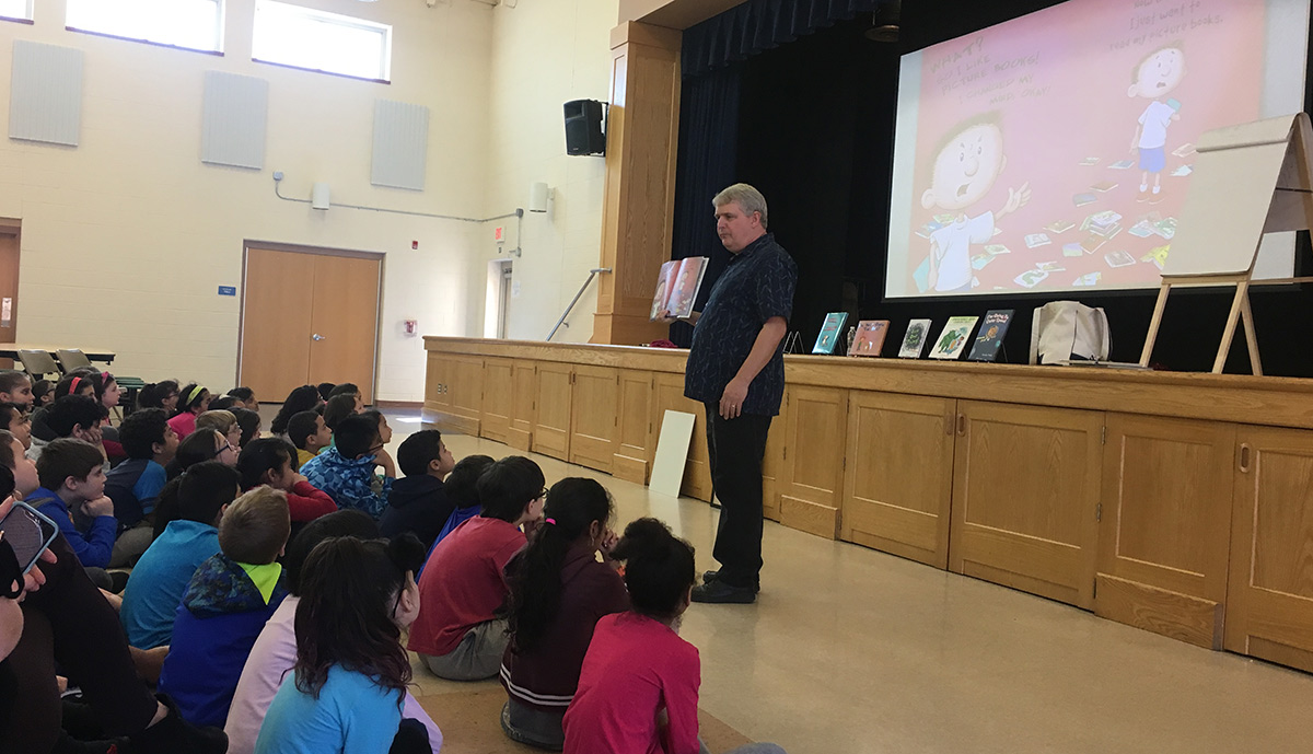 Author/illustrator Timothy Young presents to a group of elementary school students.
