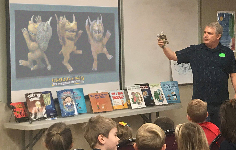 So what do you get if I visit your school? I do at least 3 assemblies. The average setup is 45 minutes for kindergarten and 1st grade and then an hour each for 2nd-3rd and 4th-5th grades. My hourlong presentation includes book readings, a very fun interactive drawing demonstration and a question and answer session that can go in many directions depending on what is asked. I bring along a lot of cool stuff. In the past I have projected my book pages on a screen while I’m reading. Last summer I found a way to create a non-linear slide show so I can jump around. I can read any book in any order and now, if someone asks about toys I’ve designed I not only hold up the toys I brought, I can also show large photos with details of the sculptures and prototypes. I just discovered that I can add video into the same presentation so I can show samples of my work on Pee-Wee’s Playhouse or Peter Gabriel’s Big Time music video or even my animated book trailers.