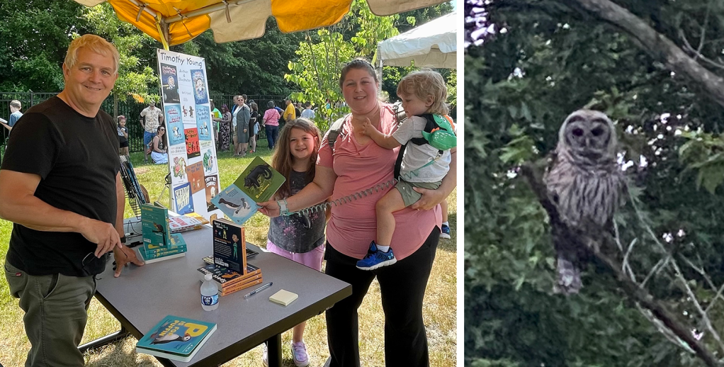 June was the month of book festivals and owls. I was invited to attend the Cecil County Children’s Book Festival and, of course, our own Chesapeake Children’s Book Festival at the Talbot County Free Library. We also were lucky to have a family of owls move into the woods next to our house. They would perch in the trees in our yard and occasionally sit on our roof. I learned that Bard Owls not only hoot, they hiss at you if you get too close.