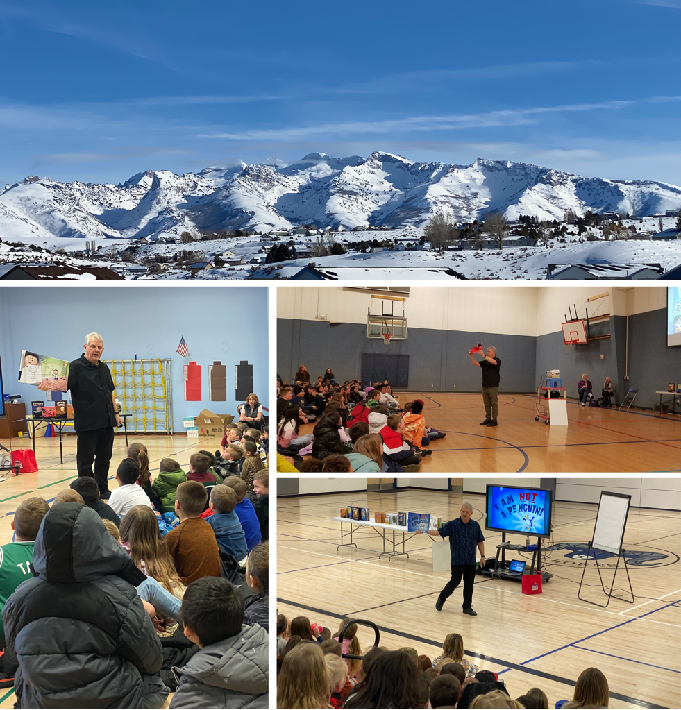 March was the highlight of my school visit year. Earlier in the year author Kim Norman contacted me. For personal reasons she was unable to do a scheduled multi-day visit and was looking for an author with room in their schedule for late February into March. That’s how I ended up traveling to Elko, Nevada for a week. I’d never been to Nevada and had never heard of Elko but I had a wonderful week there. I was supposed to visit 11 schools over 5 days. Unfortunately snow cancelled 3 of the visits but I was able to do virtual make-ups the week afterwards. I believe that Kim will be visiting them this coming March, Thanks Kim!